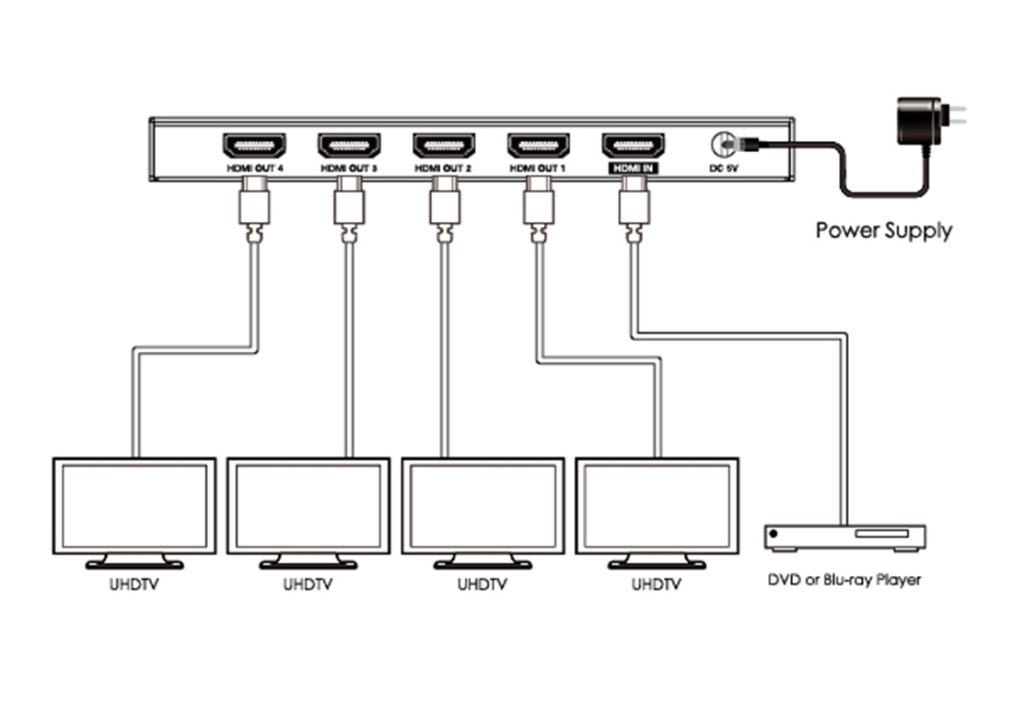 1×4 HDMI 18Gbps Splitter is an advanced solution for splitting a single HDMI signal to 4 HDMI displays. It provides high performance audio and video output through HDMI cables up to 4K2K@60Hz 4:4:4 and is capable of receiving and transmitting up to 18Gbps of bandwidth with no data loss.