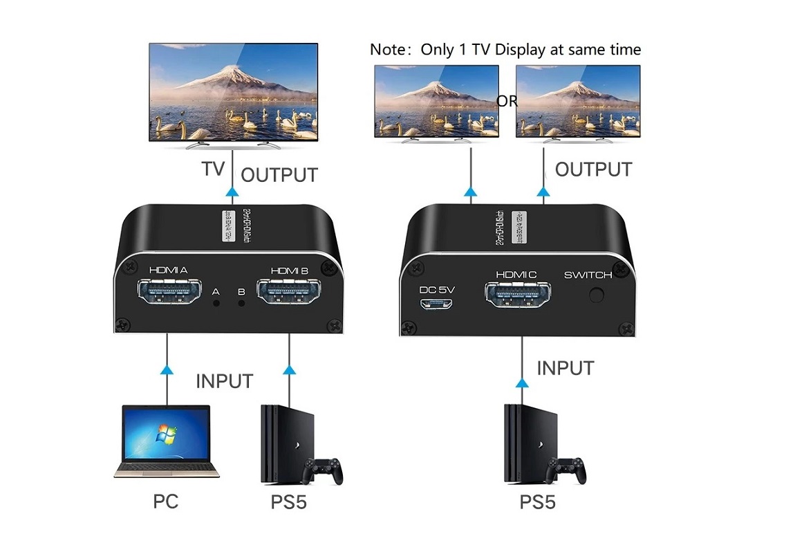 This self-powered HDMI2.1 Bi-Directional 8K Switcher (48Gbps 8K@60Hz 4K@120Hz 4:4:4) works by switching between two connected HDMI input sources to one HDMI display OR one HDMI input source to select between two HDMI displays (It is not a “Splitter”, and CANNOT show both displays simultaneously).
