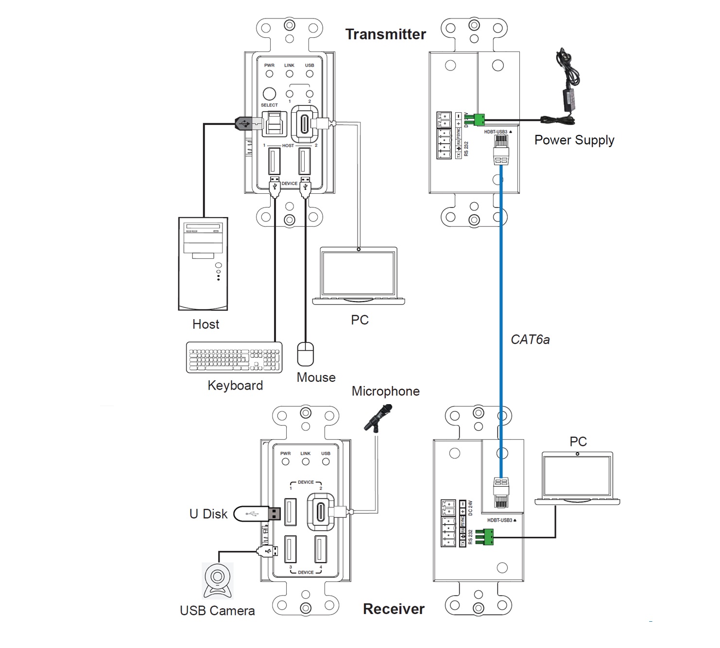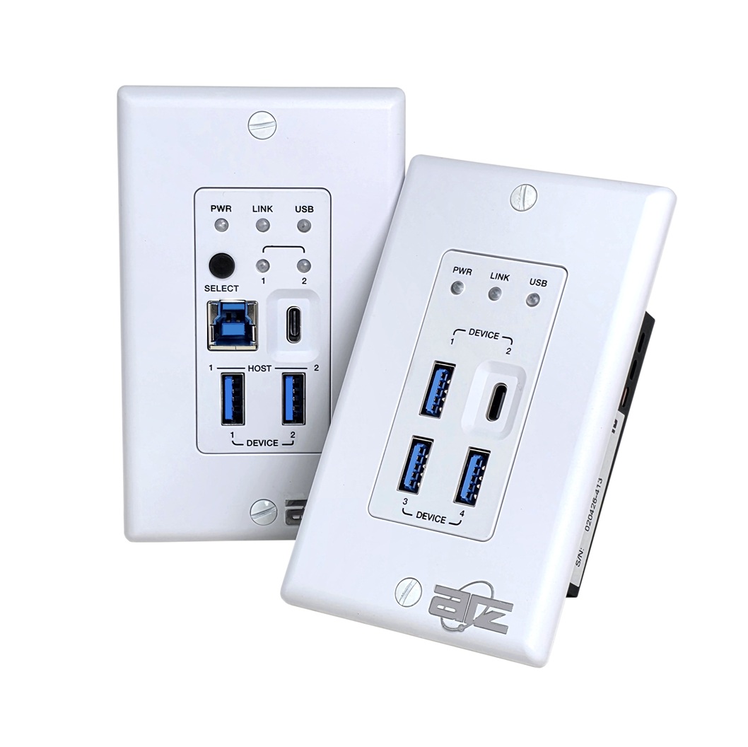 This set of US 1-Gang standard decora wall plates can extend USB 3.2 Gen 1 5Gbps signal to a distance up to 100m/328ft via a single CAT6a cable. The transmitter features one USB-C and one USB-B selectable input ports, two USB-A loop out ports. The receiver features one USB-C and three USB-A device ports. Bi-directional 24V PoC (Power over Cable) function allows users to only supply power to either the transmitter or the receiver.